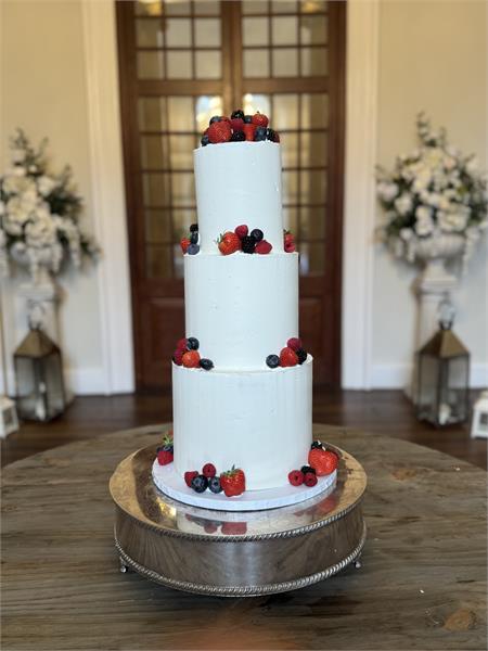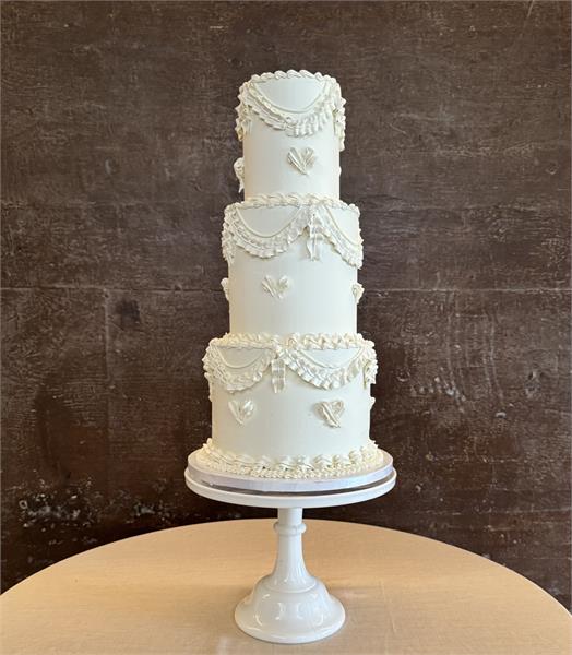During the Spring and Summer seasons, our buttercream wedding cakes feature a layer of white chocolate ganache beneath the buttercream to ensure structural stability and maintain their pristine appearance.